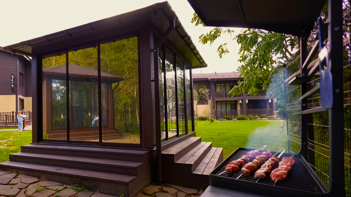 Коттедж оборудован мини террасой мангалом и уличной мебелью.